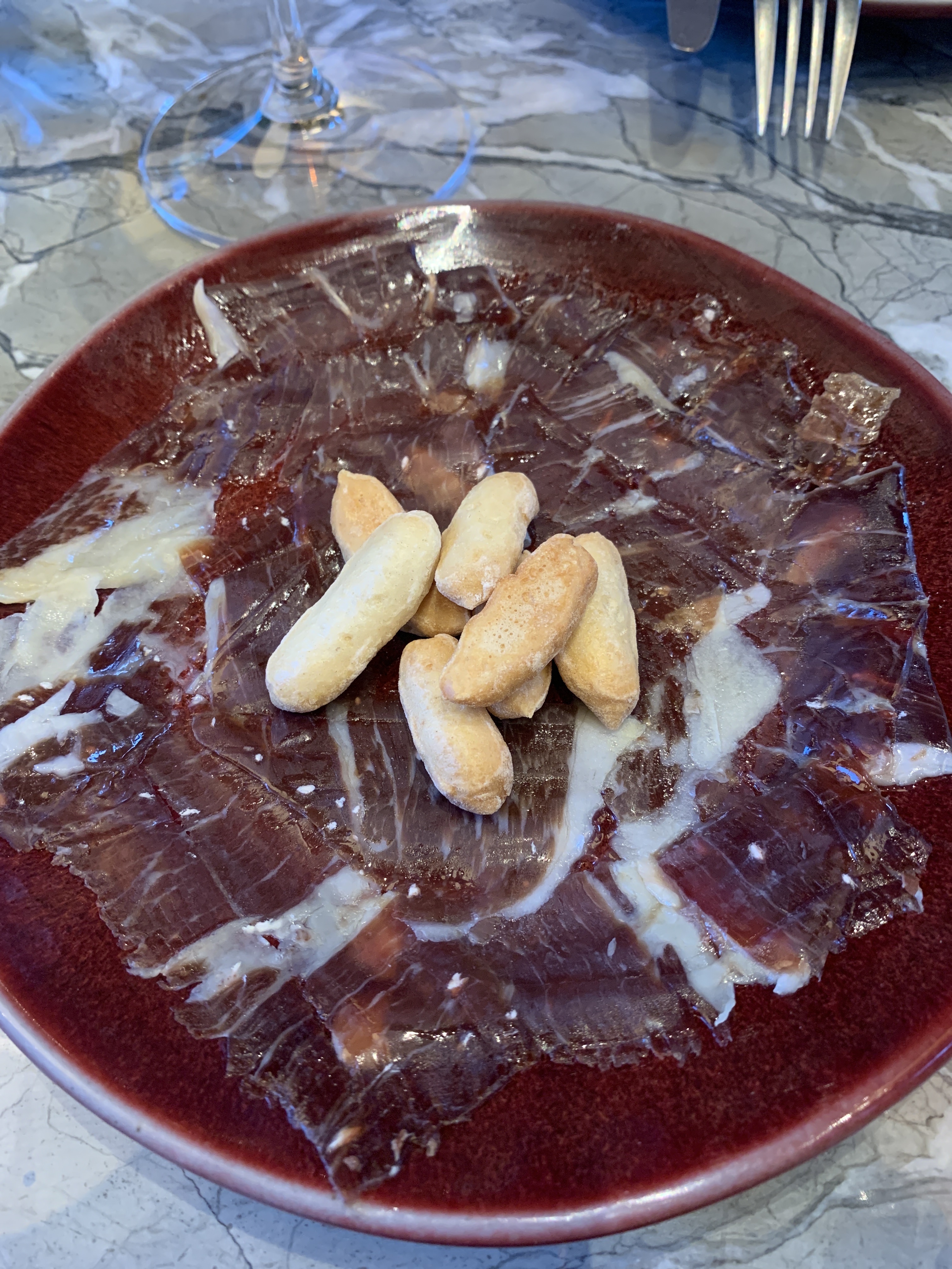 After much anticipation we sat down and shared a bottle of Austrian orange wine. As an orange wine virgin, I was very eager to see what a bottle of chilled Pinot Gris Traminer had to offer. Sweet, but not sickly, dry but not too crisp. I’d have to wet the whistle a bit more with orange wine to say I’m fully converted, but as far as a first attempt goes, perfectly passable. We narrowly missed the last plate of Sobrasada de Mallorca, so we opted for the Jamón de Jabugo. As you’d expect in a Spanish restaurant of this calibre, it did not disappoint. Sliced so delicately that specific skills are required to peel it off the plate and accompanied by the little crispsy breadsticks that everyone enjoys. It was a salivating yes from us. My gluten free dining companion opted for a side of their gluten free bread, which after arriving in its own little bag, for contamination prevention reasons, we shared. I must say, I couldn’t really distinguish the difference between gluten free and normal bread, but I feel the Pinot Gris and drink beforehand might have altered my coeliac senses.